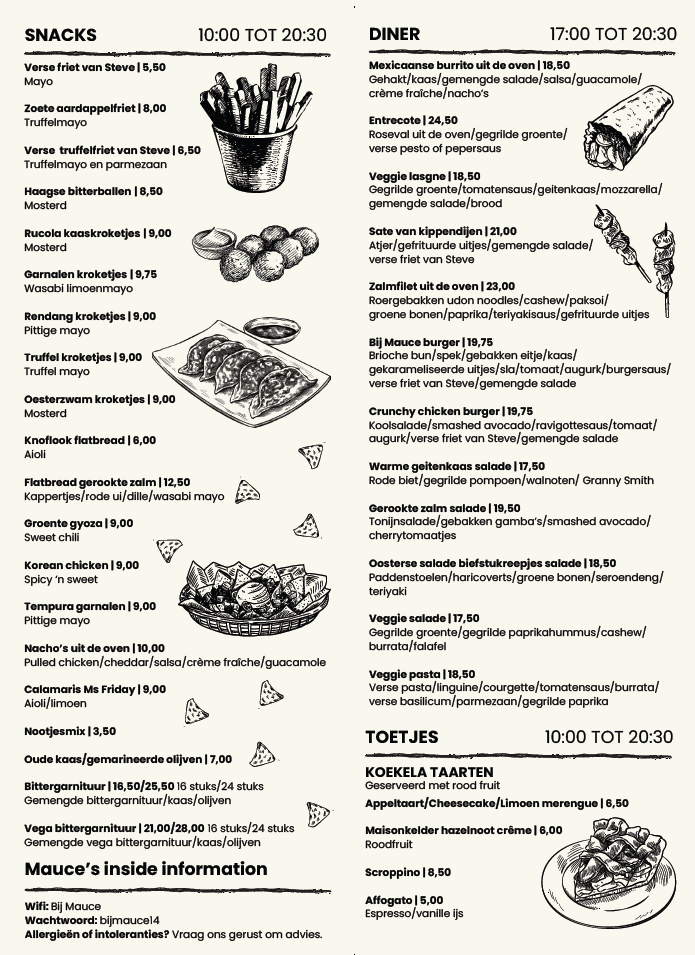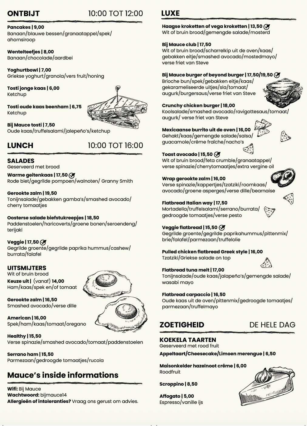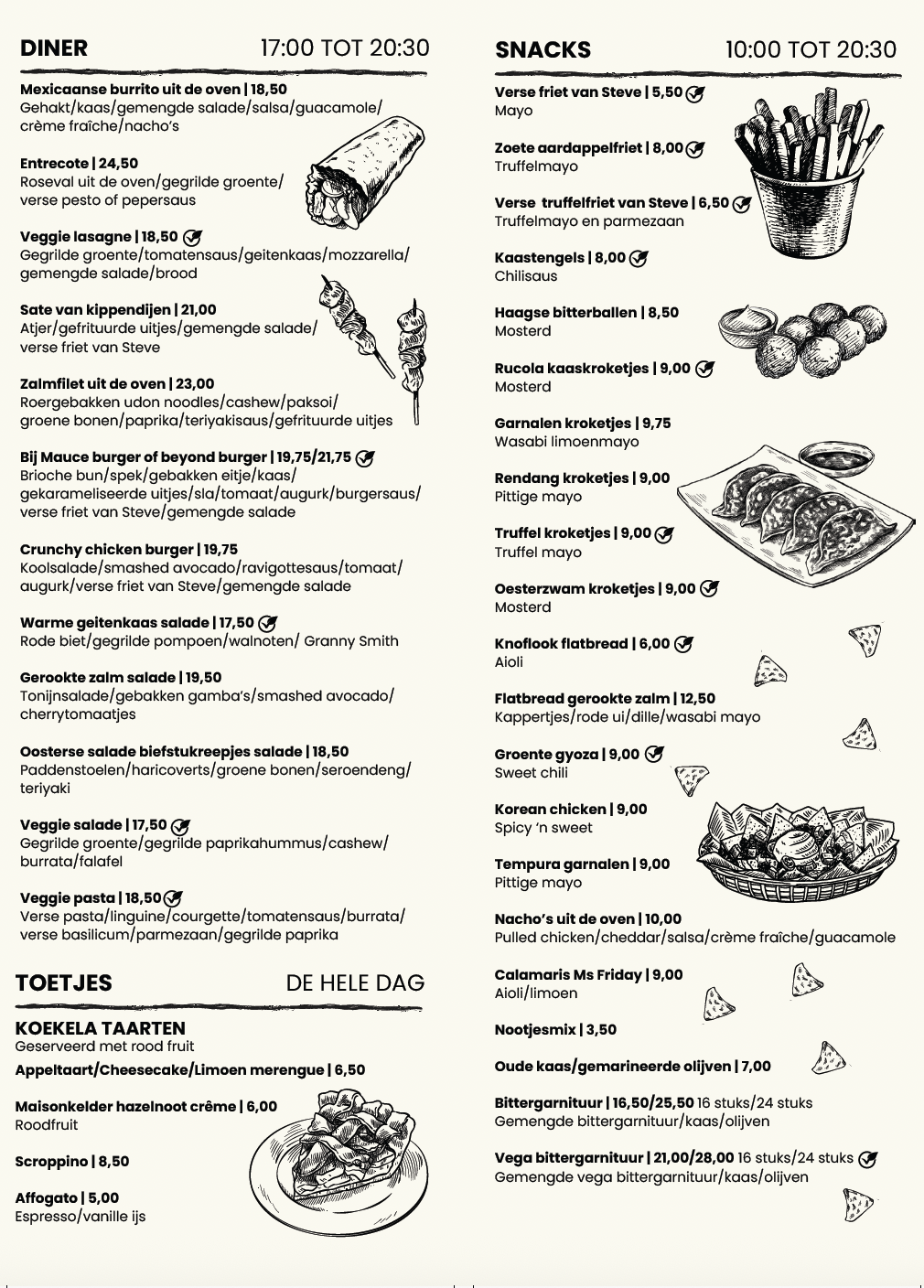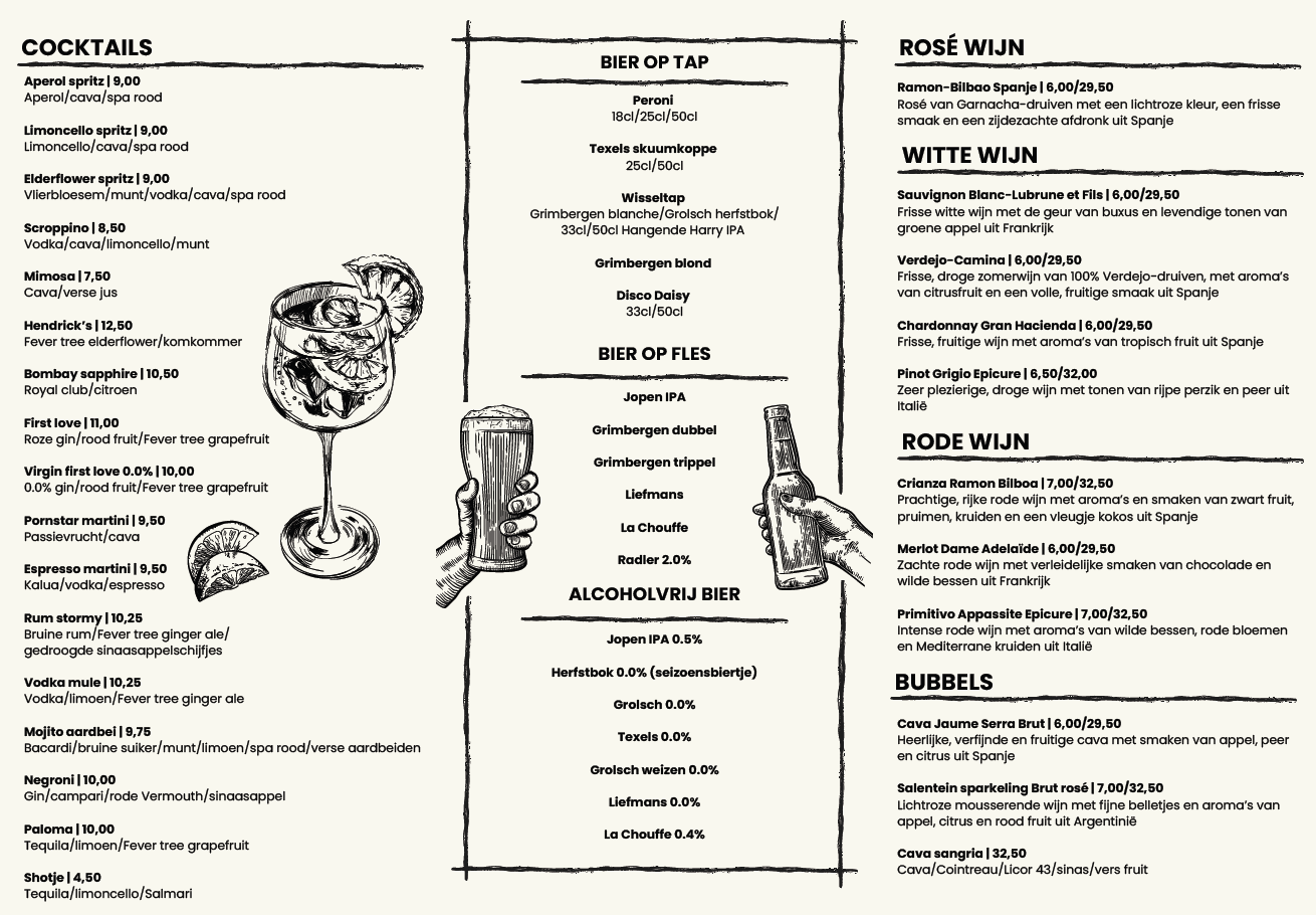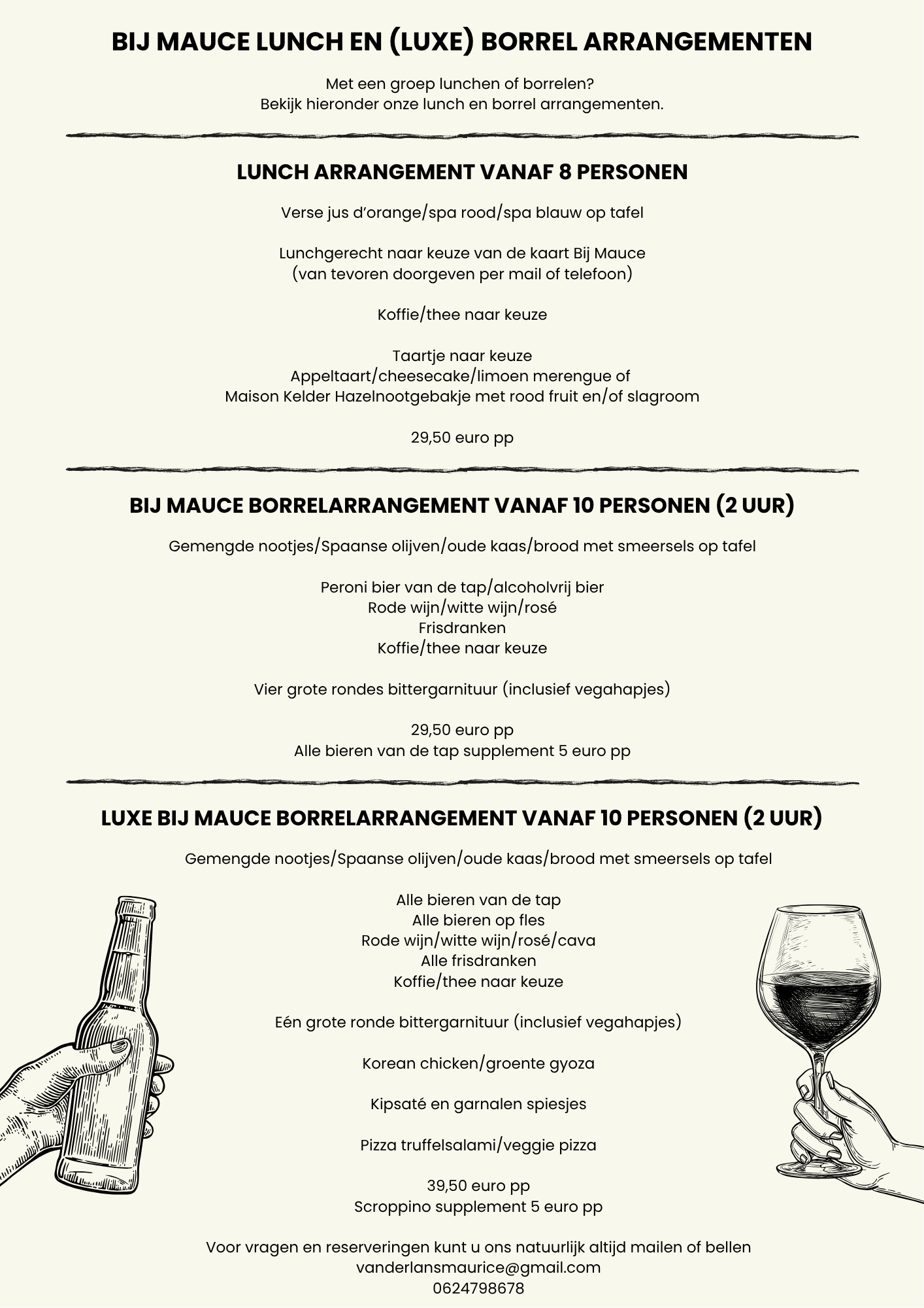Voor het reserveren van borrels of voor groepen groter dan 10 personen vragen wij u telefonisch contact op te nemen. Met mooi weer is het ook mogelijk een tafel op het terras te reserveren.